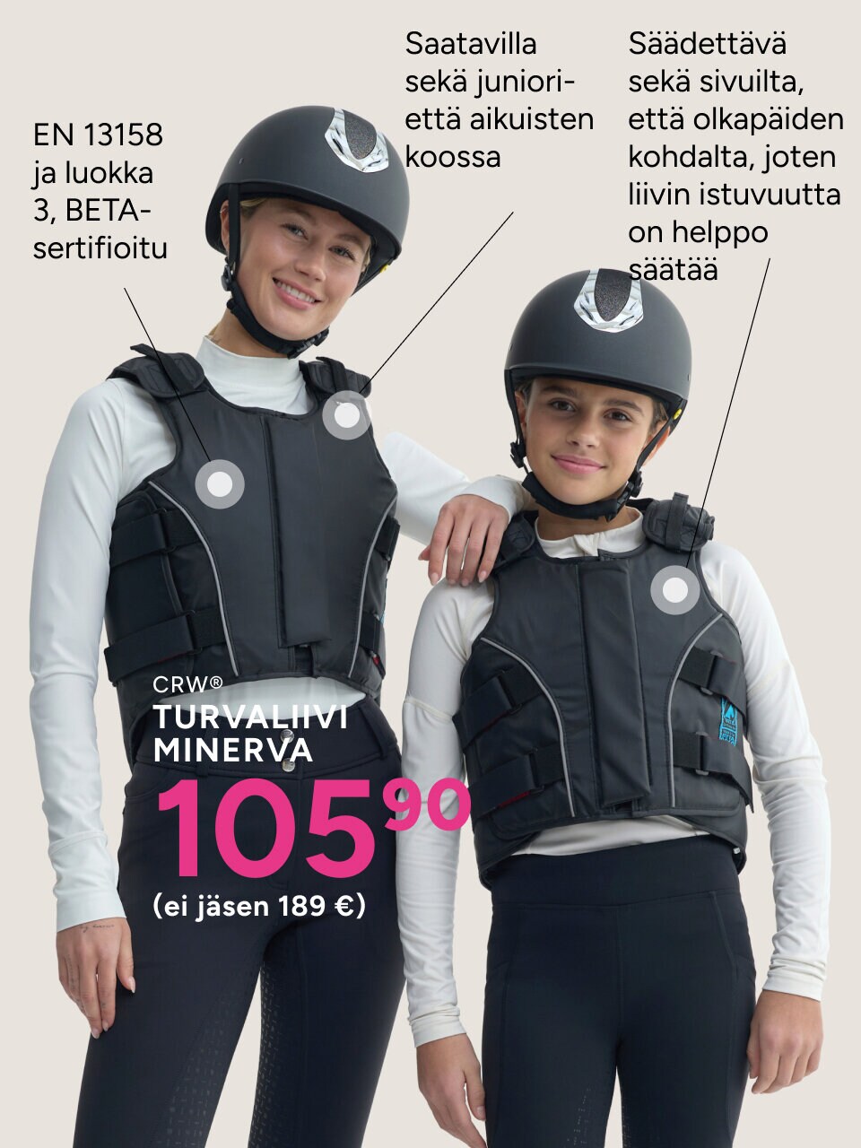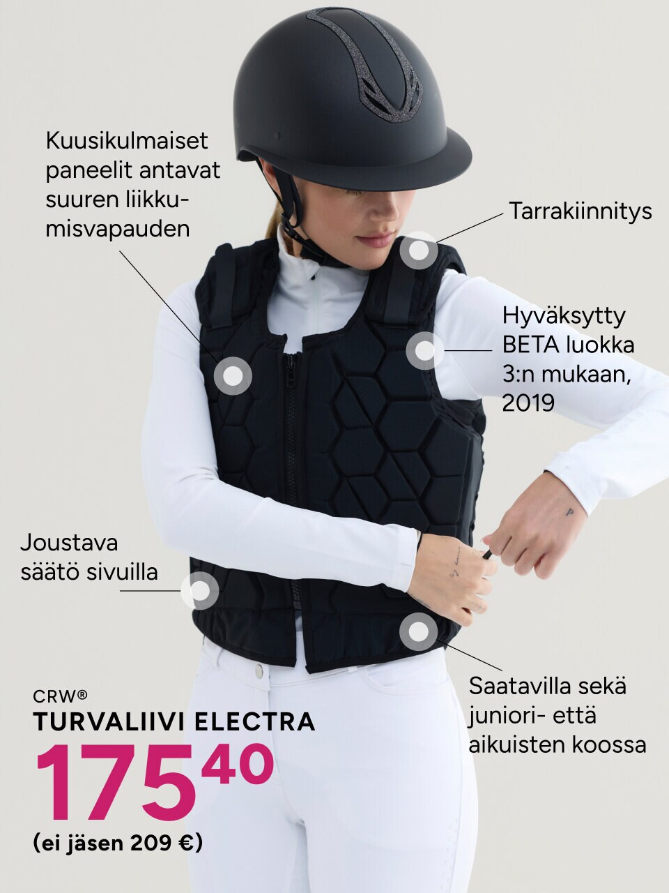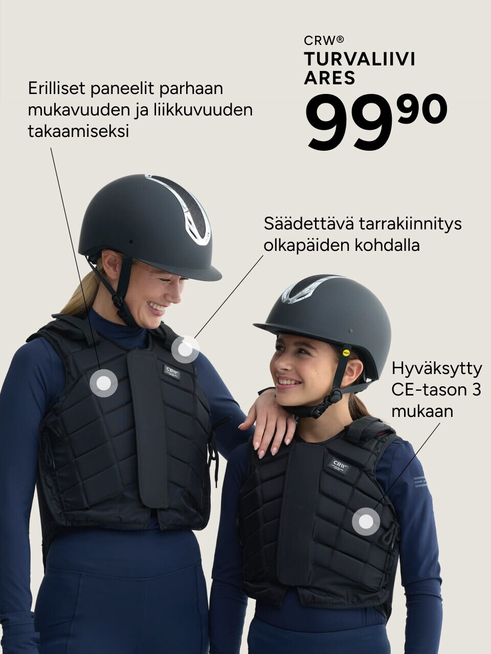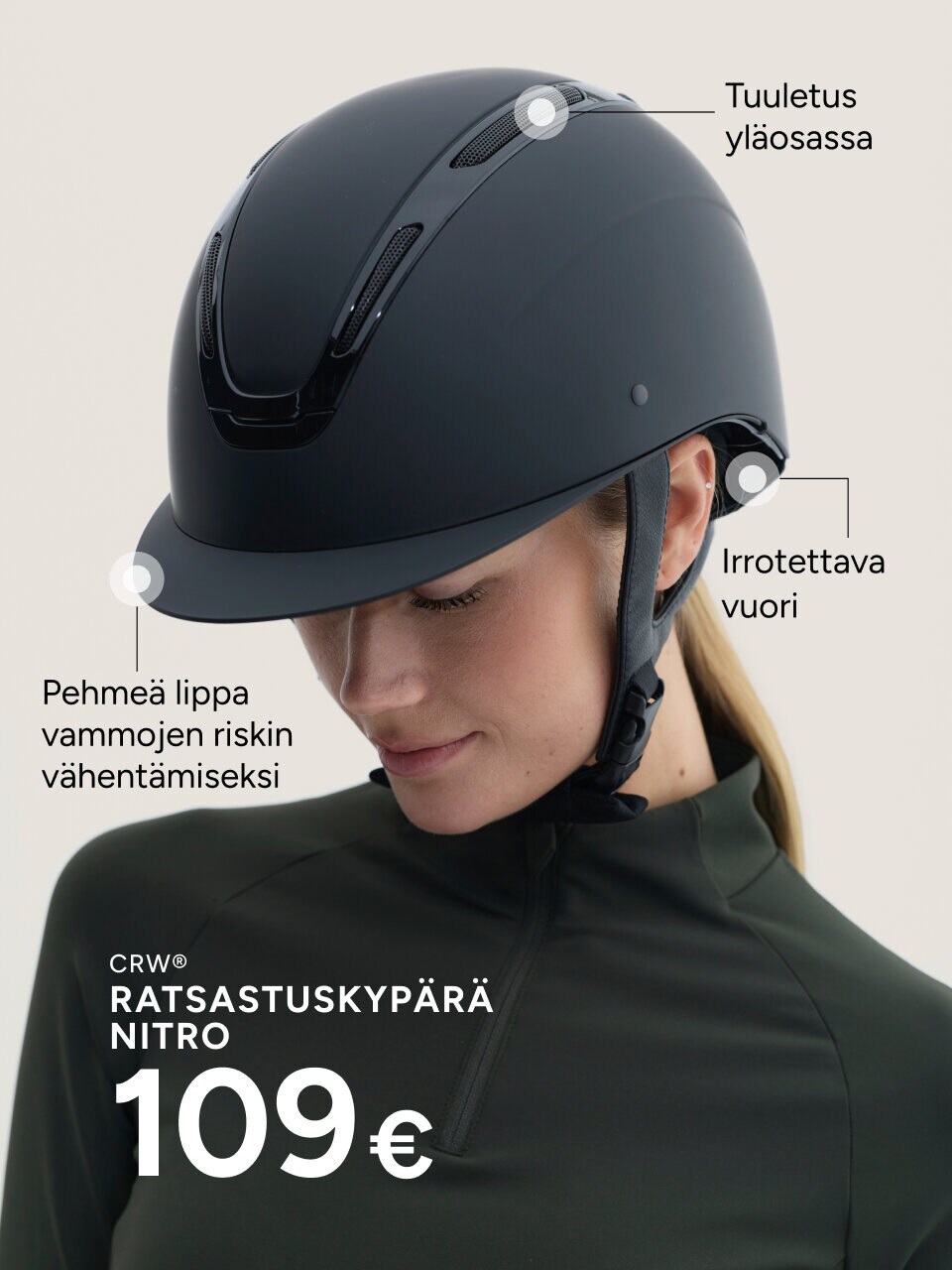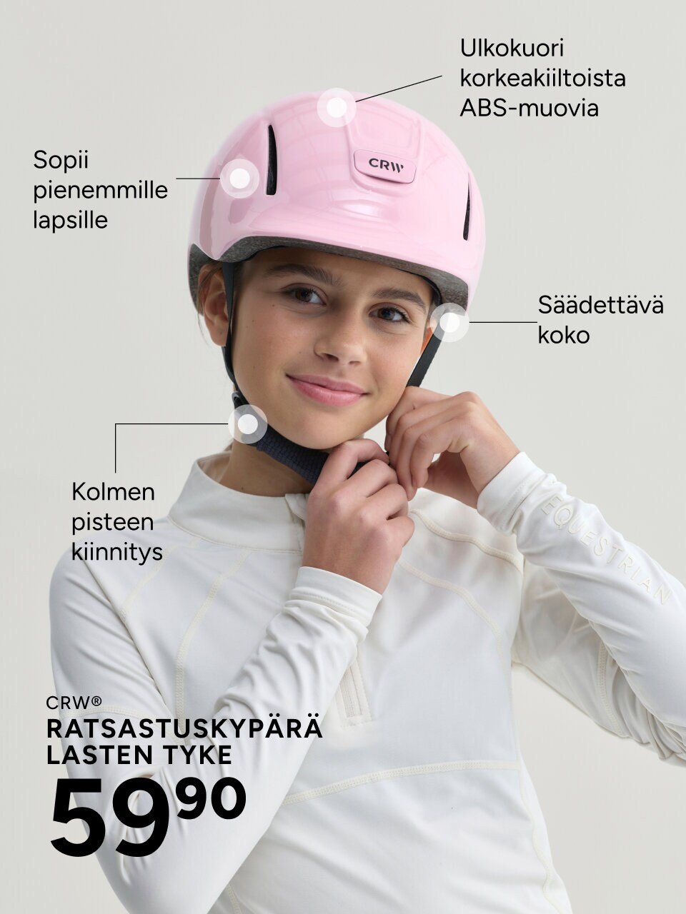 Ratsastuskypärä on tärkein turvavarusteesi. Sen tulee istua tukevasti, mukavasti ja oikein paikoillaan – turvallisuus on aina etusijalla.
