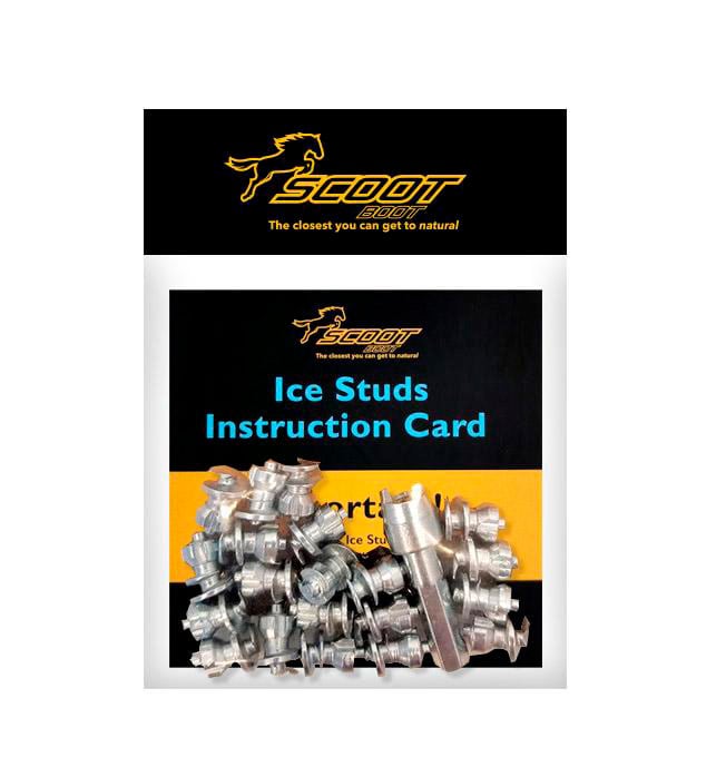 Vältä liukastelu hokeilla. Ruuvinväännin ja 4,5 mm poranterä tarvitaan reikien esiporaamiseen ennen hokkien ruuvaamista. Esiporaa reikä suoraan pohjaan, vain muutaman millimetrin syvyyteen. Sisältää 20 kpl Scoot Ice Studs hokkeja ja yhden Scoot Ice Stud -hokkiavainkärjen ruuvinvääntimeen.