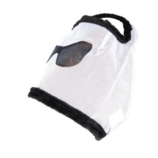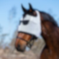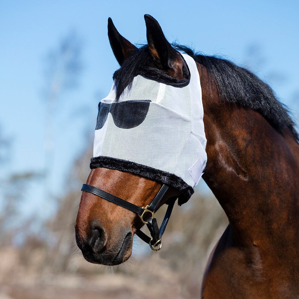 Kärpäsmaski, joka suojaa hevosen silmiä ärsyttäviltä kärpäsiltä. Maskissa on pehmeä teddyreunus sekä vahva ja leveä tarranauhakiinnitys. Hauska musta silmälasiprintti.