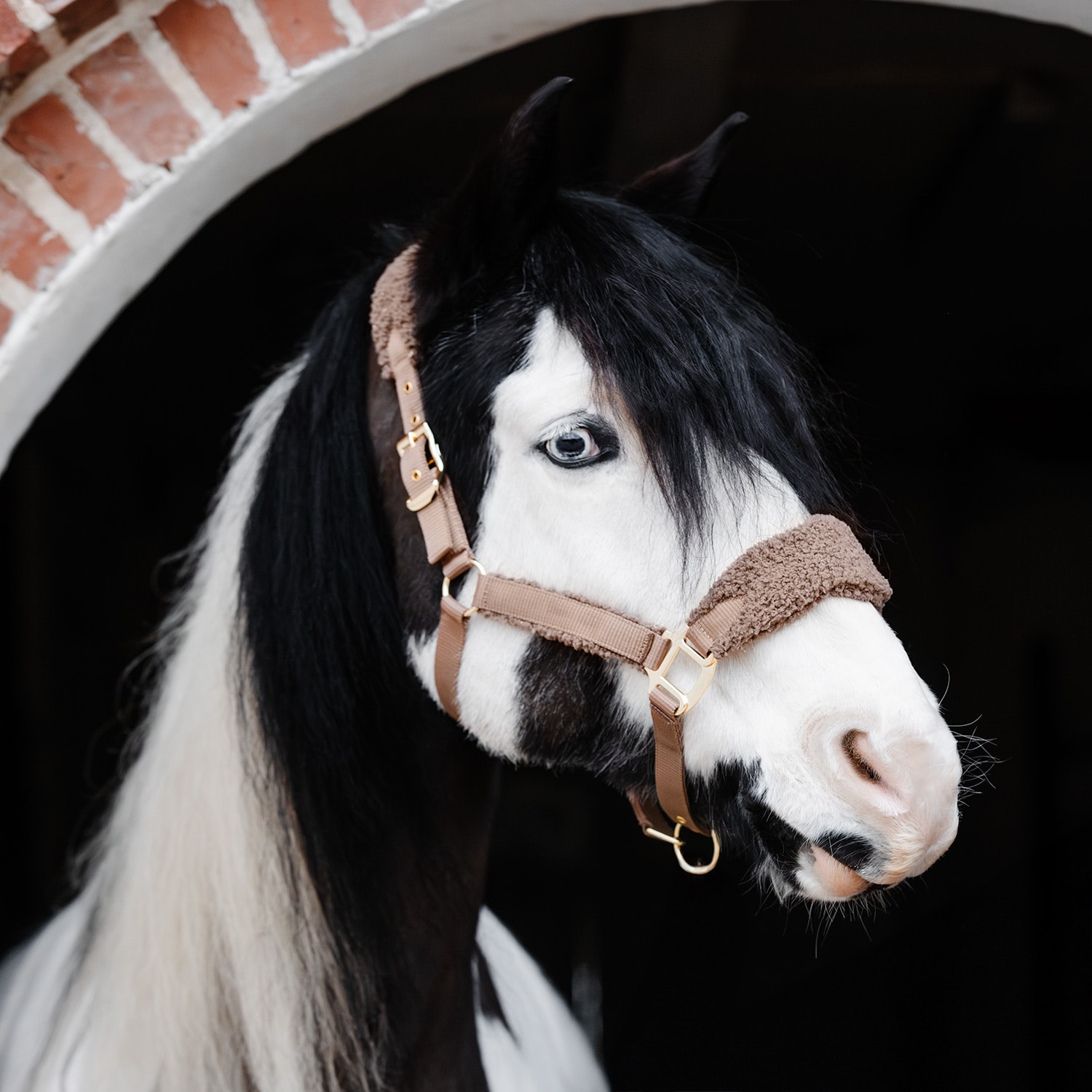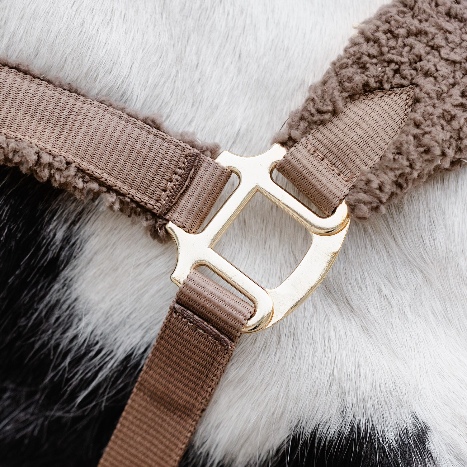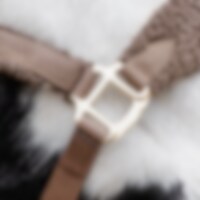 Riimu, jossa pehmeä pileevuori turvalla ja niskassa sekä säädettävissä poskihihnoissa. Kullanväriset soljet.