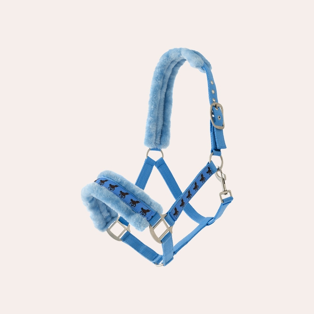 Riimu, jossa pehmeä fleecevuori turvalla ja niskassa. Koristeellinen nauha hevosilla.