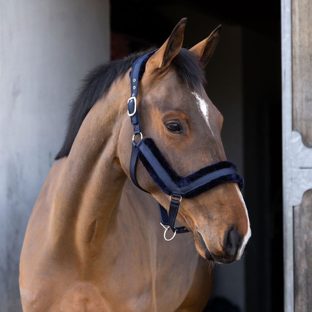 Riimu, jossa keinoturkis turvalla, niskassa ja poskihihnoissa. Leveä niskaosa, kaareva turpahihna, säätö niskan molemmin puolin ja turvan alla.