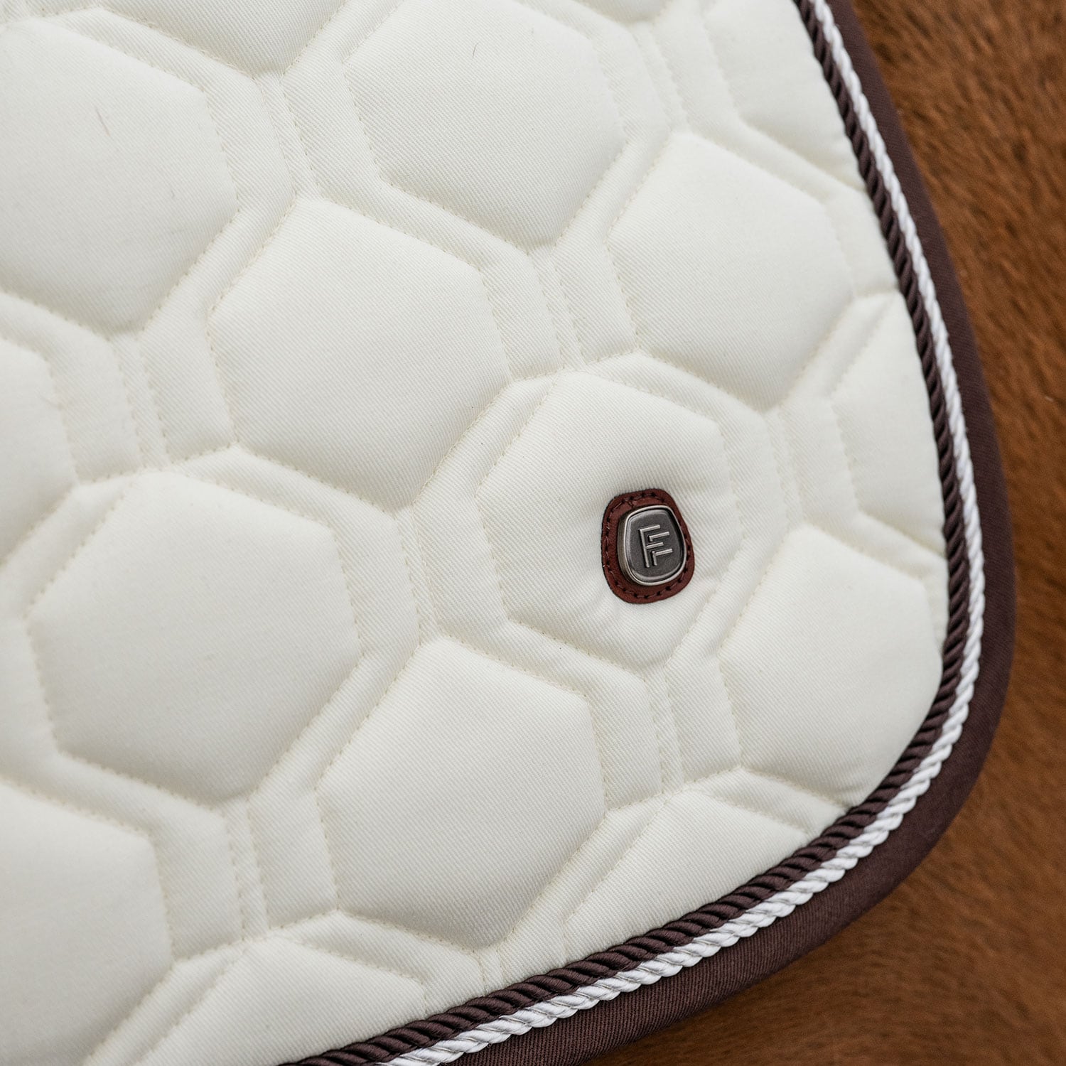 Tikattu neliöhuopa, jonka ulkopinta on kulutusta kestävää polyesteri-puuvillatvilliä. Vahva yhdistelmäpehmuste 300 g polyfill + 1 cm vaahtomuovi, jonka ansiosta neliöhuopa on tukeva, säilyttää muotonsa ja pysyy paikallaan. Sisäpinta teknistä 100 % polyesteriä, joka siirtää pois kosteutta hevosen iholta. Teddyvuoraus sään kohdalla ehkäisee hiertymiä ja selän 3D-verkkopaneeli parantaa hengittävyyttä. Useimpiin satuloihin sopivassa neliöhuovassa on erikoisvahvistettu satulavyön kohta kulutuskestävyyden parantamiseksi ja lyhyet lenkit satulan D-renkaaseen kiinnitystä varten. Koristeina kaksi silkkiterettä ja metallilogo.