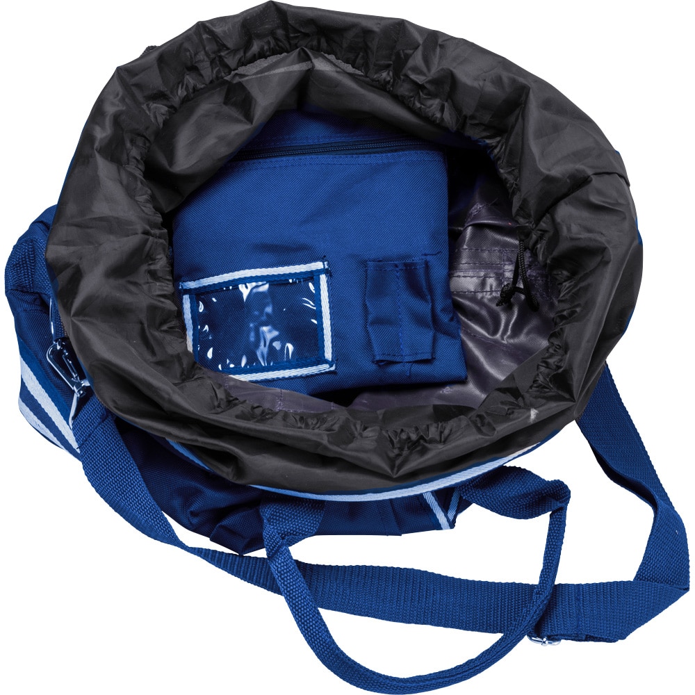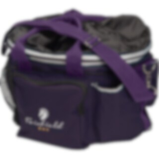 Harjalaukku, jossa kantokahva ja säädettävä olkahihna. Vetoketjullinen kansi estää harjojen putoamisen. Ulkopuolella taskuja pikkutavaroille ja sisäpuolella vetoketjutasku. Ø noin 38 cm. Korkeus: noin 27 cm.