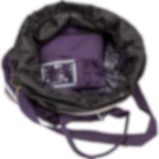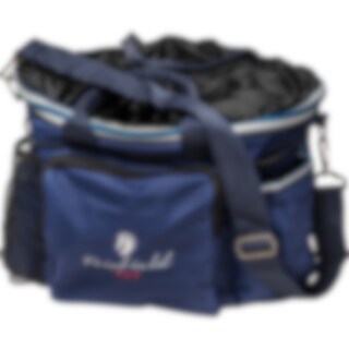Harjalaukku, jossa kantokahva ja säädettävä olkahihna. Vetoketjullinen kansi estää harjojen putoamisen. Ulkopuolella taskuja pikkutavaroille ja sisäpuolella vetoketjutasku. Ø noin 38 cm. Korkeus: noin 27 cm.
