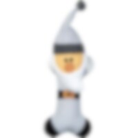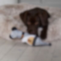 Mjuk stoppad hundleksak i fuskmocka. Inspirerad av tomtens nissar. Med pipljud. Längd cirka 35 cm, från toppen av luvan till kroppens slut.