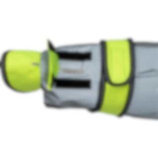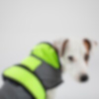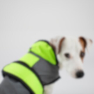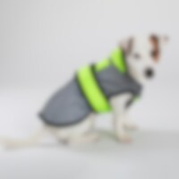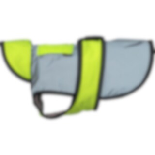 Heijastintakki heijastavaa kangasta, kaulus, halkio ja mahavyö fluoresoivaa keltaista 420D-polyesteriä. Keltaiset osat erottuvat hyvin hämärässä, ja reunusnauha ja heijastinlangat parantavat näkymistä pimeimpään aikaan. Vedenpitävä. Vuoraus joustavaa polyesterifleeceä, joka lämmittää ja antaa liikkumisvapautta. Kauluksessa aukko taluttimelle, selässä halkio valjaita varten.