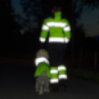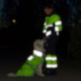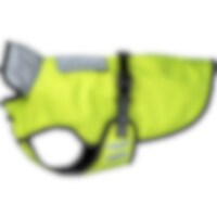 Heijastintakki fluoresoivaa keltaista 420D-polyesteriä, kaulus ja halkio heijastavaa kangasta. Keltainen päällyskangas erottuu hyvin hämärässä, ja reunusnauhat ja heijastinlangat parantavat näkymistä pimeimpään aikaan. Vesitiivis (vesipilari 3000 mm) takki pitää koiran kuivana lenkillä. Vuoraus ohutta mikrofleeceä, joka lämmittää ja antaa liikkumisvapautta. Kauluksessa aukko taluttimelle, selässä halkio valjaita varten.