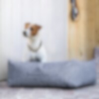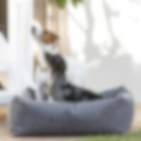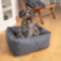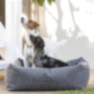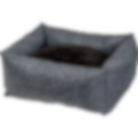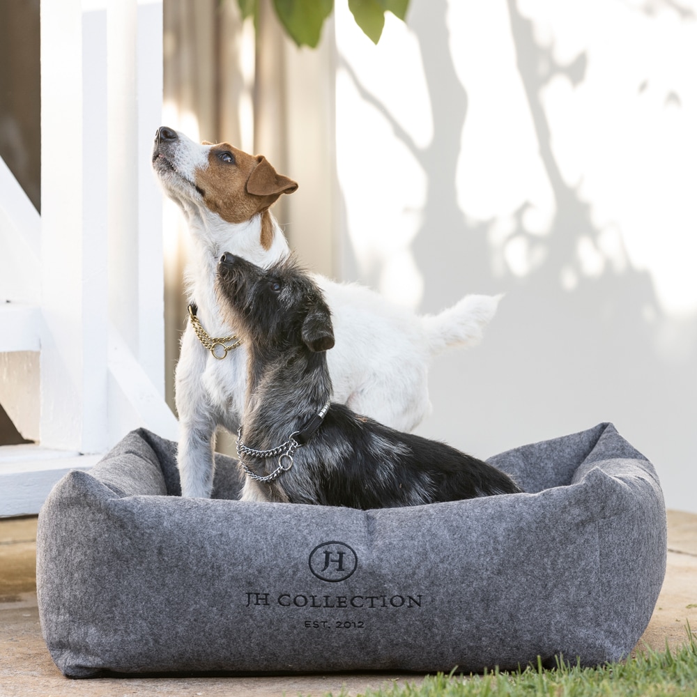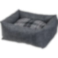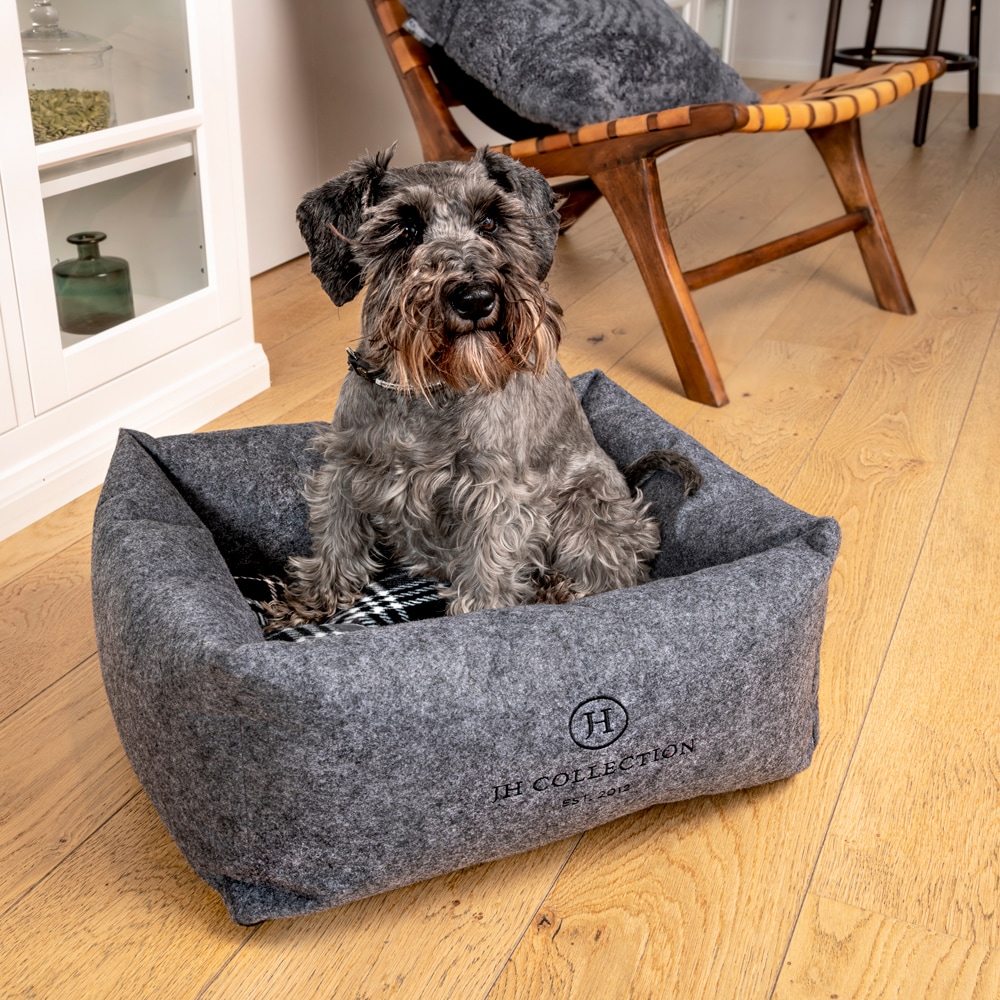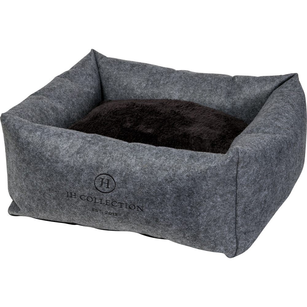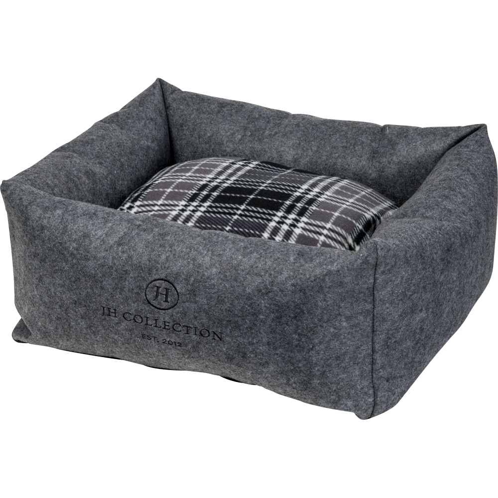 Ylellinen huopapeti, JH Collection -kirjailu. Irtotyynyn vetoketju helpottaa hoitoa ja pesua. Toinen puoli ruudullista fleeceä ja toinen mustaa pehmeää teddy fleeceä. Tyyny kestää pesun 30 asteessa. S: 52 x 45 x 18 cm. M: 68 x 58 x 23 cm. L: 78 x 71 x 26