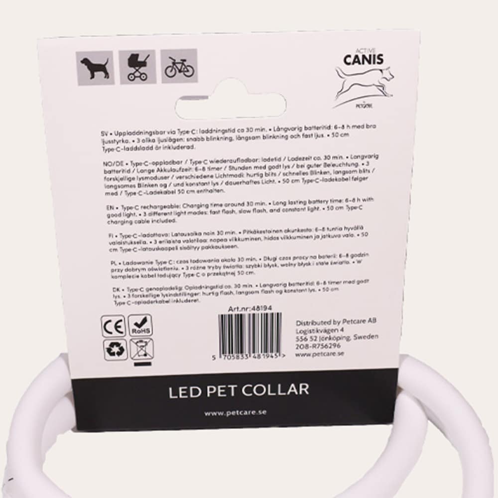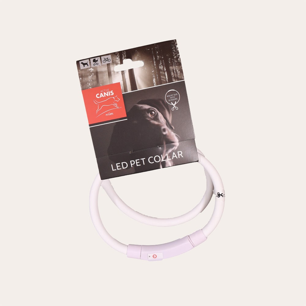 LED-kaulapanta, kolme valoasetusta: nopeasti vilkkuva, hitaasti vilkkuva ja tasaisesti palava valo. Panta ladataan USB-johtoa käyttämällä. Pannan pituus on 80 cm. Kokoa on helppo säätää leikkaamalla sopivaan pituuteen. Akun lataaminen kestää noin 30 minuuttia, tehokkaan valon käyttöaika 6–8 tuntia. Sisältää USB-latausjohdon.