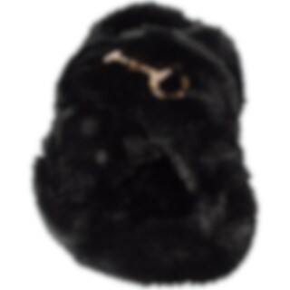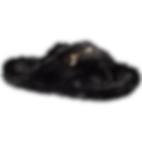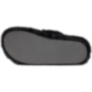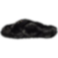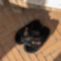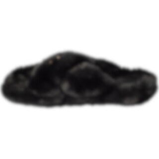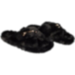 Tohvelissa kumipohja ja yläosa paksua synteettistä turkista. Koristeena kullanvärinen kuolain.