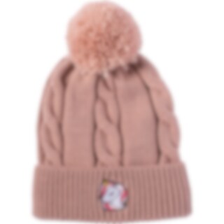 Palmikkoneulemyssy, jossa tupsu. Käänteessä edessä koristebrodeeraus.