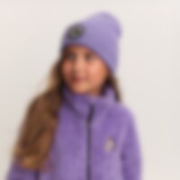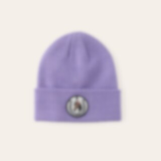 Lämmin joustinneulemyssy pehmeää lankaa. Leveä käännös, jossa koristeellinen merkki edessä keskellä.