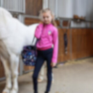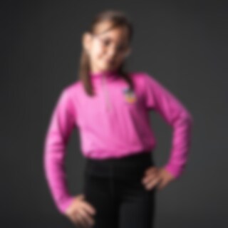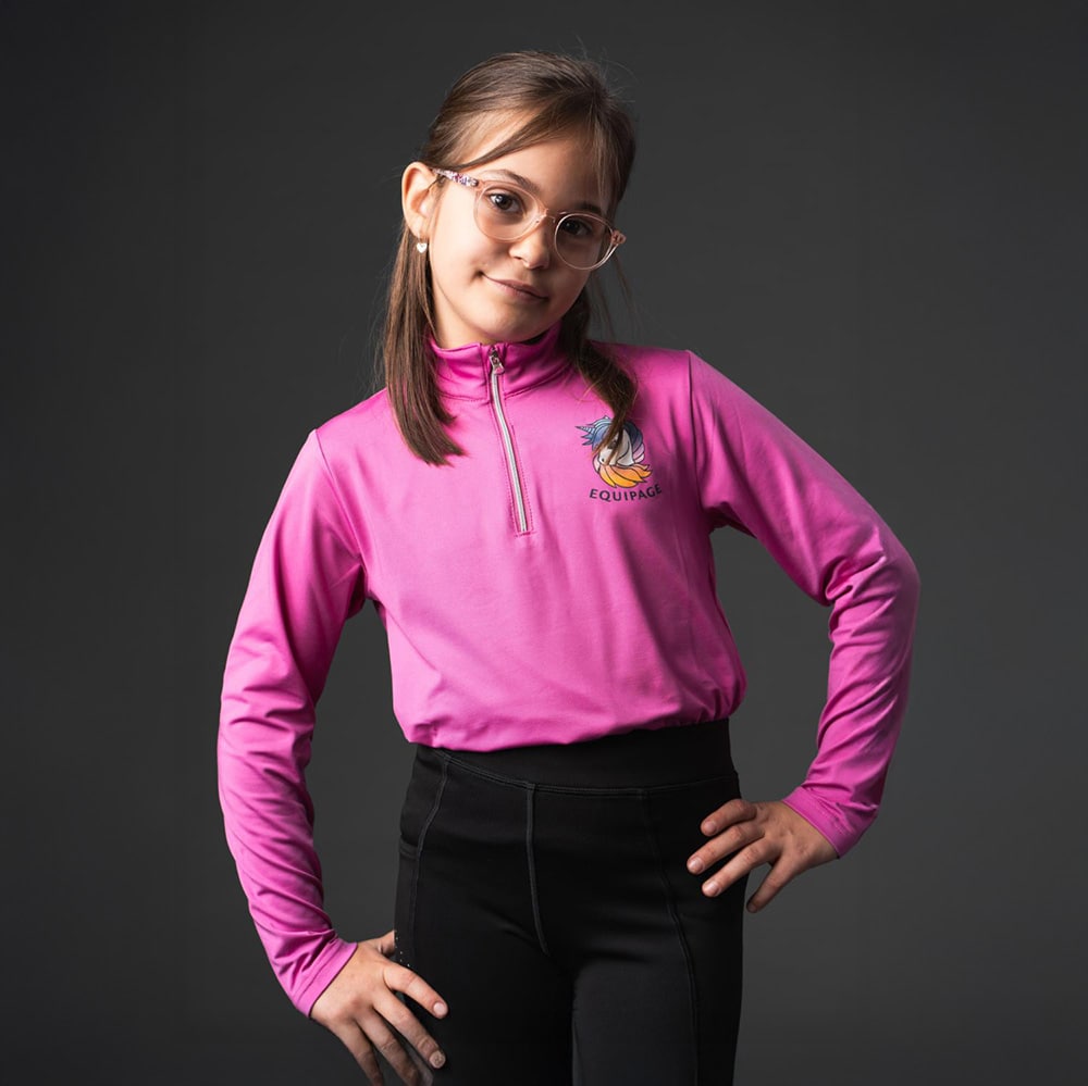 Pitkähihainen paita, jossa korkea kaulus ja puolivetoketju. Pieni etupainatus, jossa värikäs yksisarvinen. Tekninen ja joustava kangas kosteutta siirtävällä harjatulla taustalla.