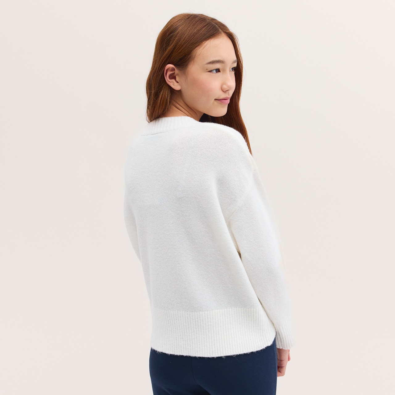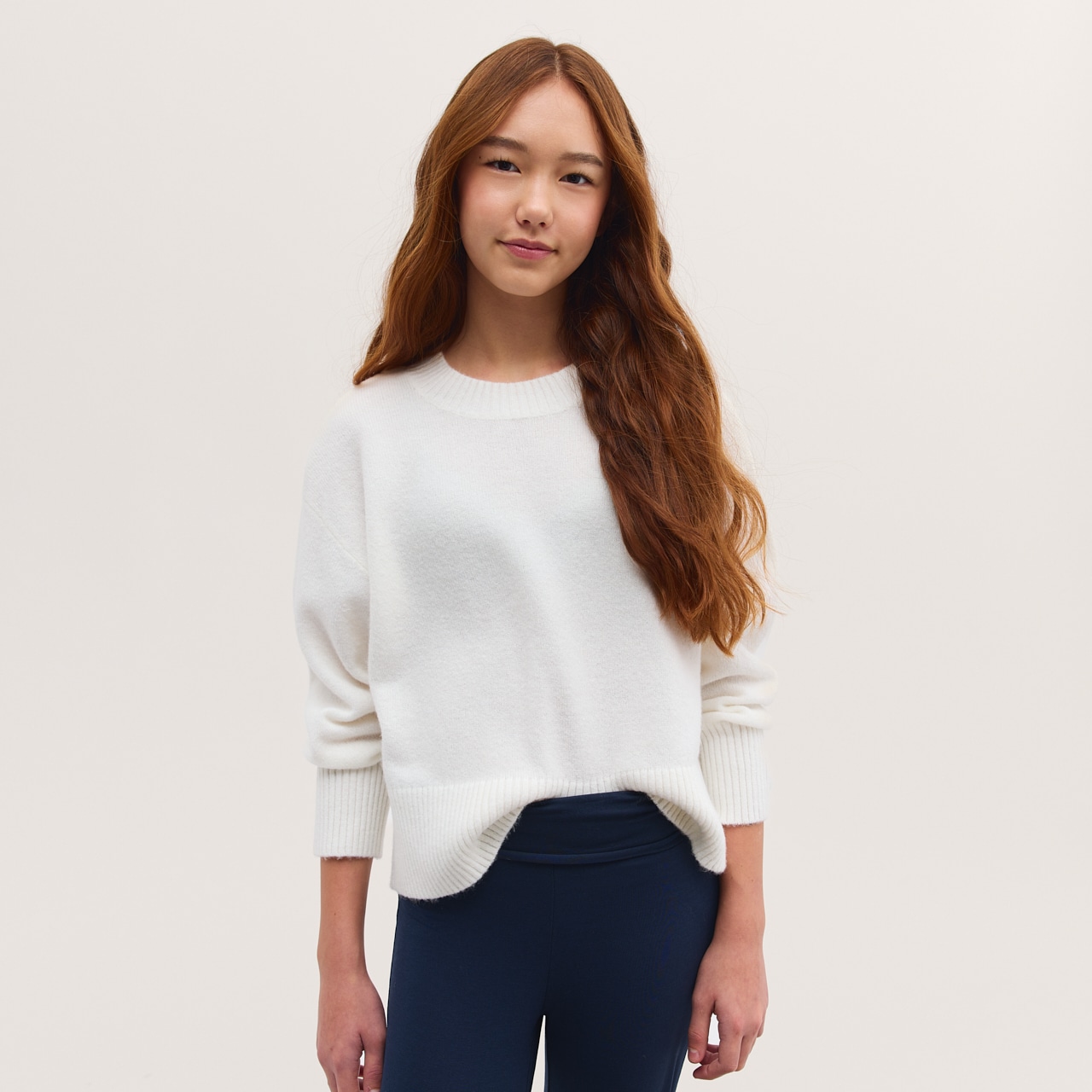 Pehmeä ja mukava neulepusero. Tilava malli, pyöreä kaula-aukko, ribbineulos hihansuissa ja helmassa.