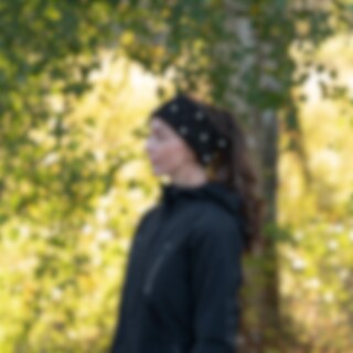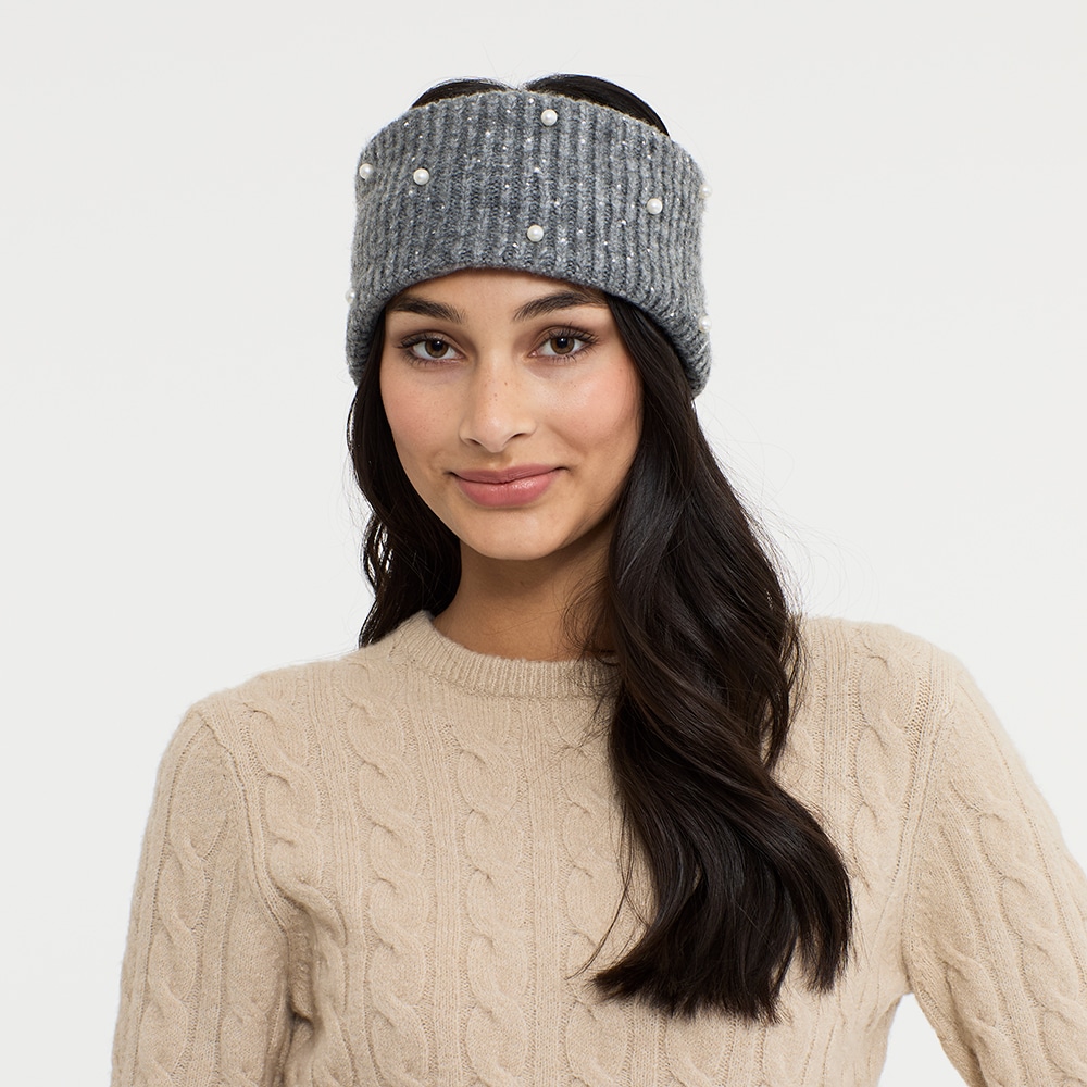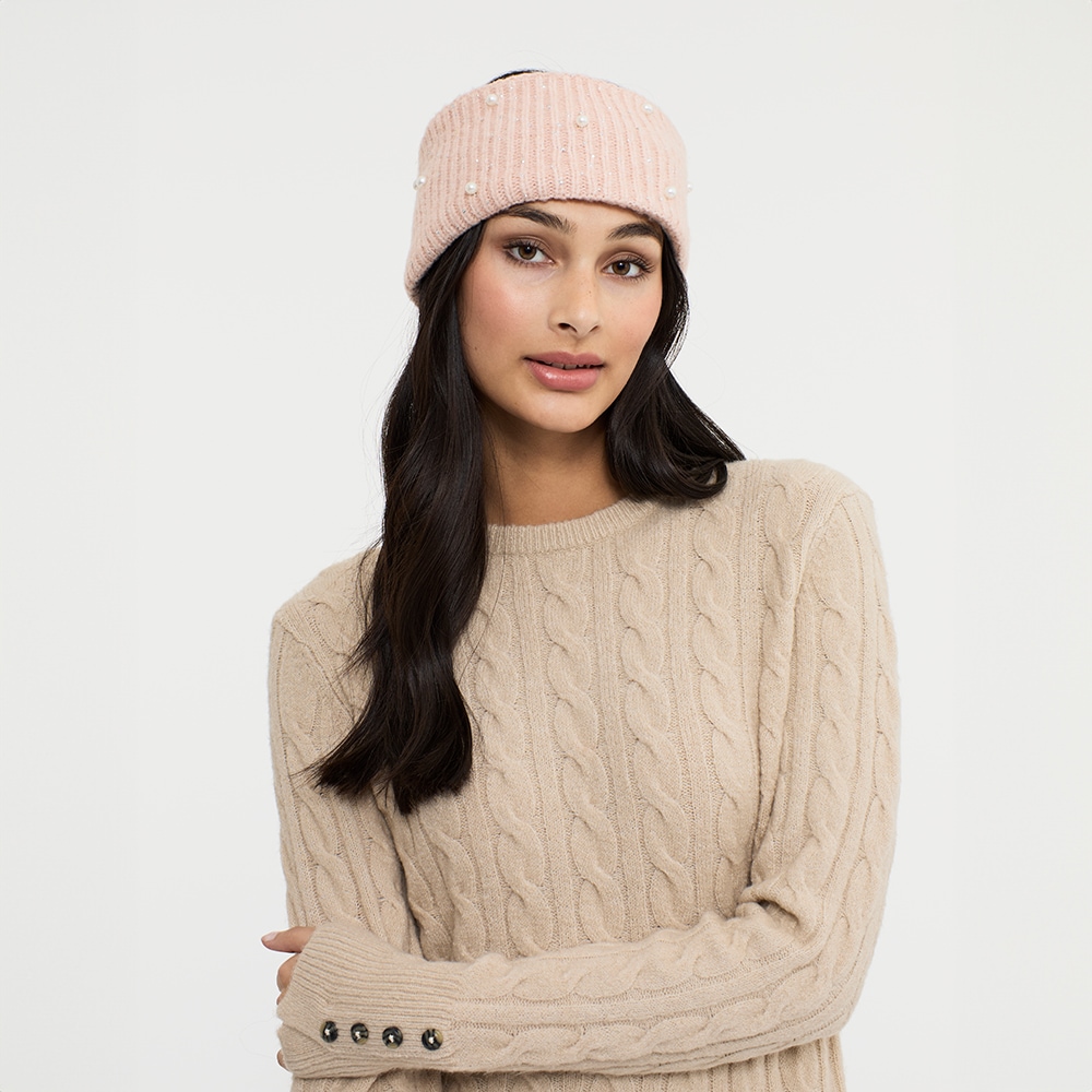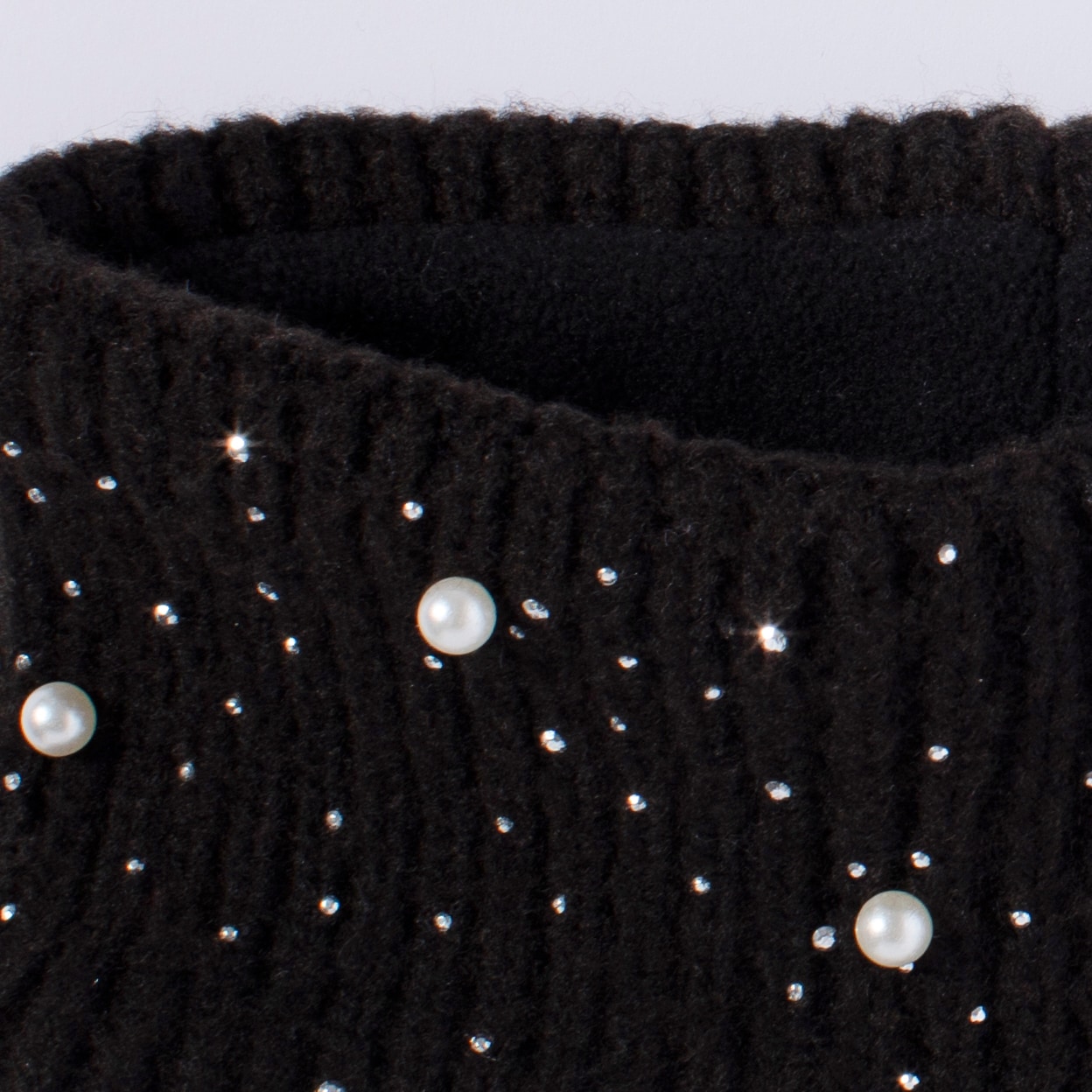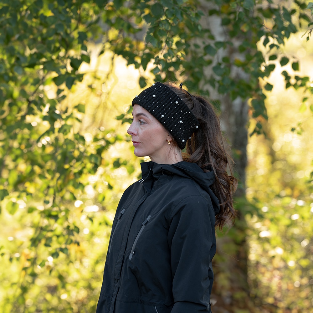 Fleecevuorinen joustinneulepanta. Panta on koristeltu helmillä ja strassikivillä, jotka antavat sille huolitellun ja modernin ilmeen. Yksi koko.