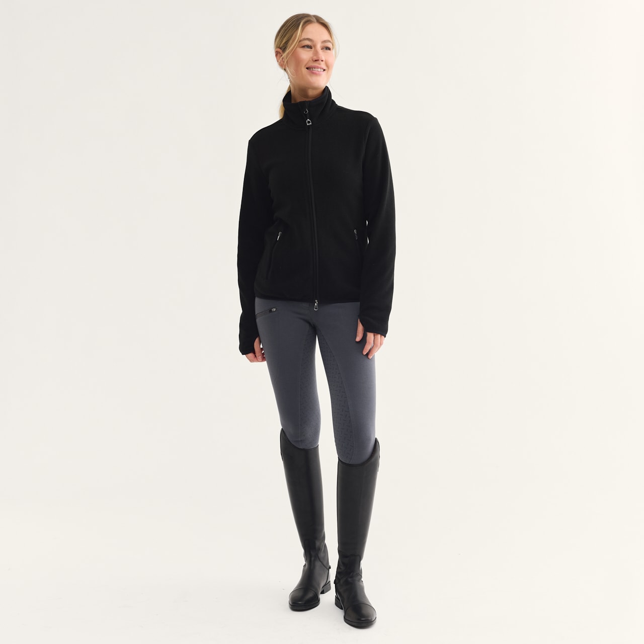 Klassinen fleecetakki, yksinkertaisen tyylikäs malli. Ohutta ja pehmeää materiaalia. Korkea kaulus ja käytännöllinen kaksisuuntainen vetoketju edessä. Joustavat hihansuut ja helma. Vetoketjulliset sivutaskut.