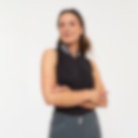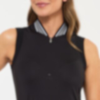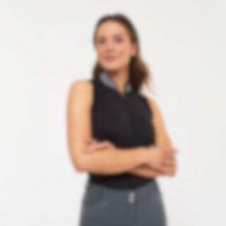 Hihaton toppi pehmeää ja joustavaa teknistä materiaalia. Toimiva muotoilu, jossa vartalonmyötäinen leikkaus. Resoripystykaulus, jossa kudotut raidat, jotka antavat ajattoman ja urheilullisen ilmeen, sekä resorit hihansuissa. Edessä piilovetoketju. Täydel