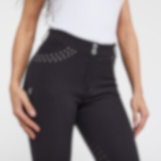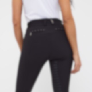 Ratsastushousut joustavaa teknistä neulosmateriaalia, satulaleikkaus. Mukavat muotonsa säilyttävät housut kestävät kulutusta ja hylkivät likaa. Grippipolvipaikat. Grippi jatkuu reiden sisäpinnalle ja antaa optimaalisen pidon ja tuen satulassa kokopaikkaisten housujen tapaan. Joustavat lahkeensuut. Normaalikorkuinen vyötärö ja kaksoiskiinnitys varmistavat istuvuuden ja mukavuuden. Kaksi taskua edessä ja kaksi vetoketjutaskua takana. Huomaamaton reisitasku puhelimelle. Taskujen koristekivet antavat housuille tyylikkään ilmeen. Istuvuudeltaan pienehkö, suosittelemme valitsemaan yhtä kokoa suuremman.