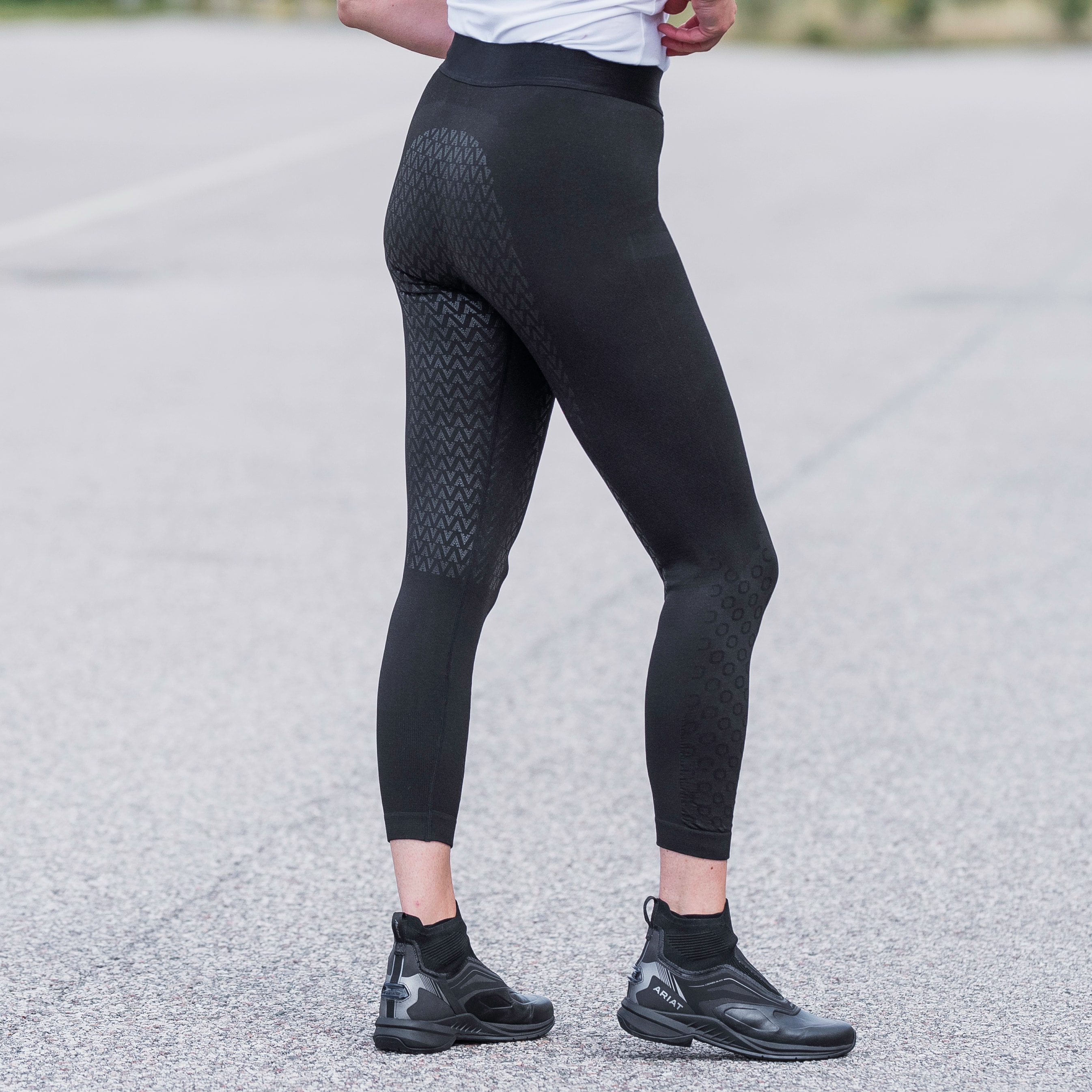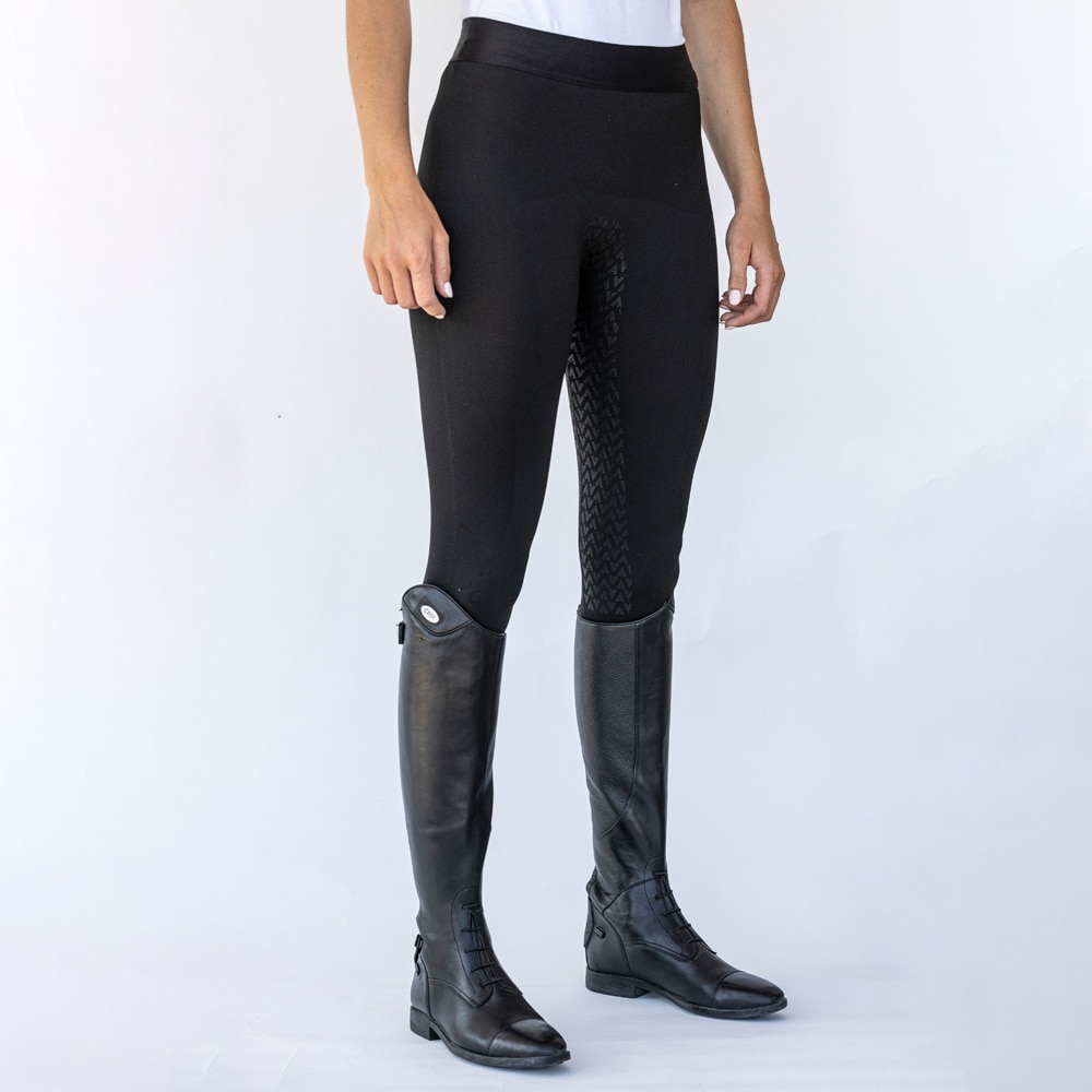 Ihoa myötäilevät Seamless-ratsastuslegginsit, ei hankaavia saumoja. Haarakiila takaa mukavuuden. Tekninen materiaali on hengittävä ja kuivuu nopeasti. PU-grip-kokopaikat. Mukavat pitkillä ratsastusretkillä lämpimässä säässä. Pitää olon miellyttävän viileänä myös tallitöissä.