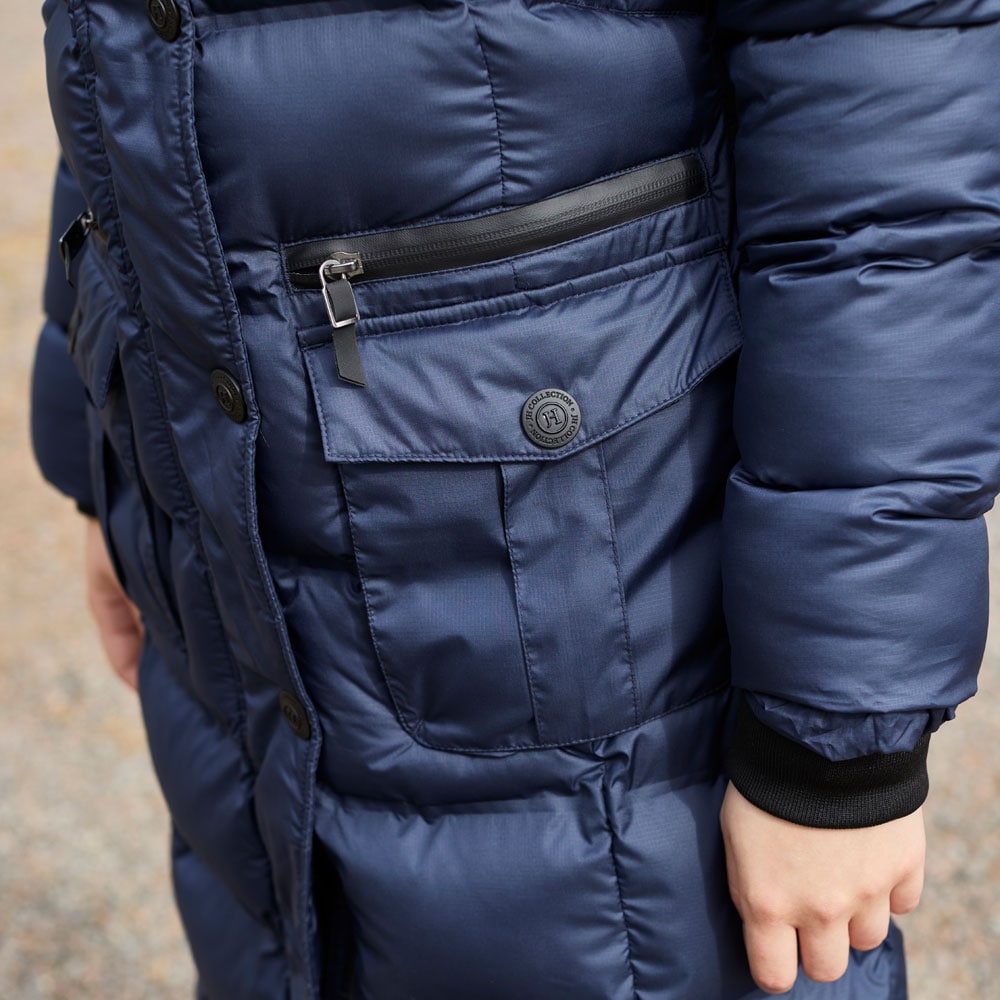 Vettähylkivä ja lämminvuorinen takki, hitsatut osastot ilman ompeleita. Korkea kaulus ja irrotettava tekoturkisvuori. Kaksisuuntainen vetoketju edessä ja vetoketjullinen ratsastushalkio takana. Neljä vetoketjutaskua ja kaksi paljetaskua edessä. Resorit hihansuissa. Tuotteessa on Rudolf Bionic Finish Eco -käsittely ja Thermolite®-täyte.