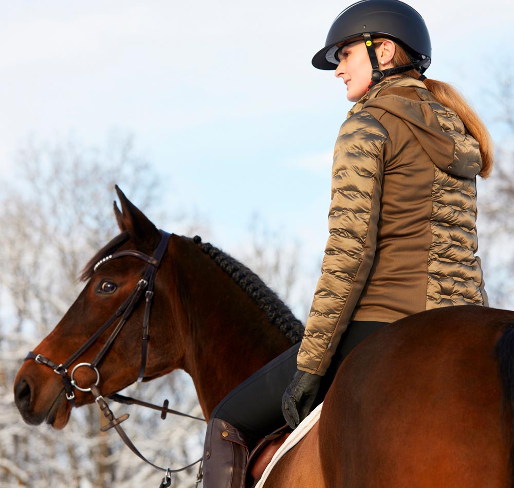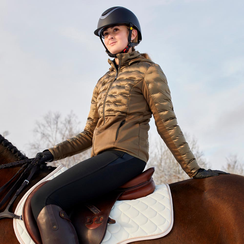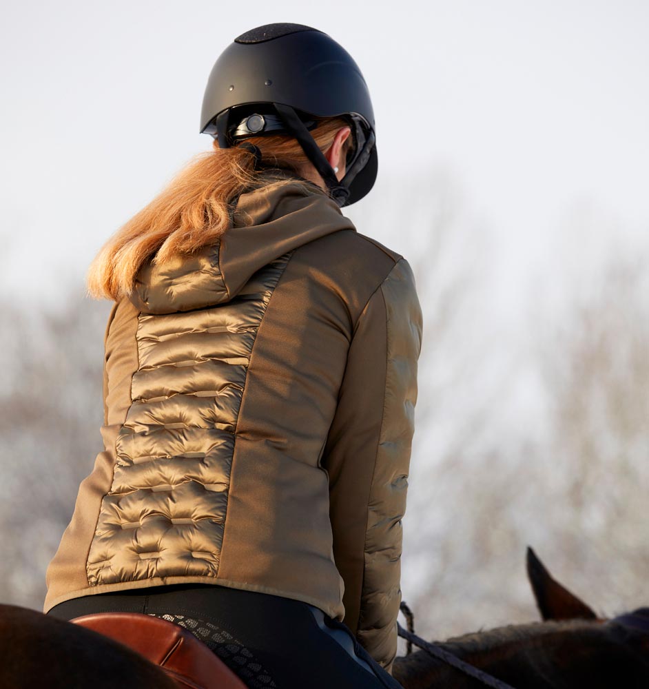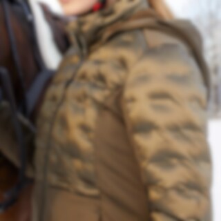 Vartalonmyötäinen puffertakki hohtavapintaista kangasta. Täytetty untuvatäytettä muistuttavalla polyesterivanulla. Kaksi vetoketjutaskua, irrotettava huppu. Sivupaneelit Power stretch -fleeceä, mukava ja istuvuutta parantava harjattu sisäpinta. Kauluksen sisäpuoli fleeceä. Metallisissa vetoketjuissa logovetimet.