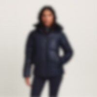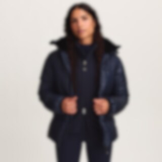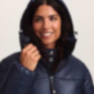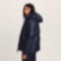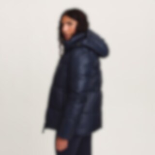 Urheilullinen ja lämmin talvitakki kiiltävällä viimeistelyllä. Kierrätetystä polyesteristä valmistettu pehmuste, jonka ominaisuudet jäljittelevät ja antavat untuvan tunteen.