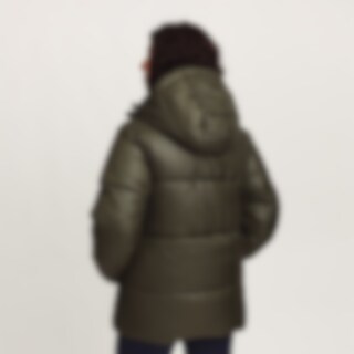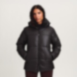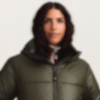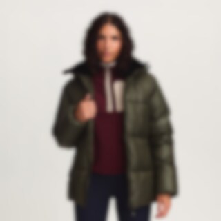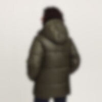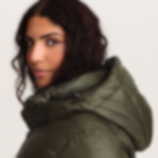 Urheilullinen ja lämmin talvitakki kiiltävällä viimeistelyllä. Kierrätetystä polyesteristä valmistettu pehmuste, jonka ominaisuudet jäljittelevät ja antavat untuvan tunteen.