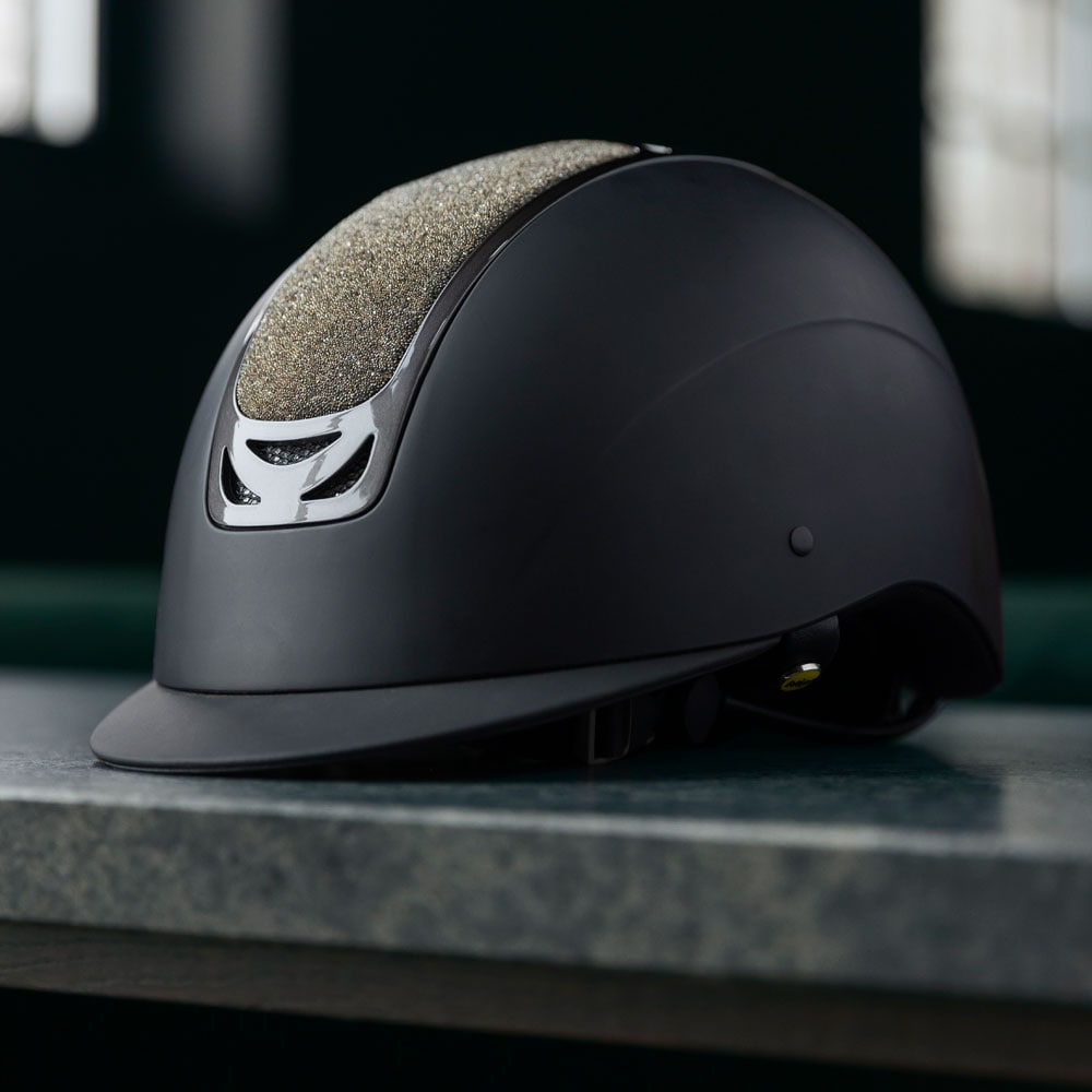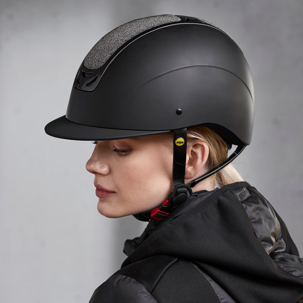 Ratsastuskypärä MIPS-järjestelmällä, joka jäljittelee ihmisen pään omaa turvajärjestelmää. Kun päähän kohdistuu vinoja iskuja, aivot liikkuvat aivo-selkäydinnesteessä, joka vaimentaa aivoihin kohdistuvia voimia. MIPS-teknologia perustuu integroituun pienikitkaiseen kerrokseen, joka voi tietyissä tapauksissa absorboida osan vinon iskun energiasta, joka voisi muuten aiheuttaa aivovaurion. Irrotettava ja pesunkestävä vuori. Takana säätönappi. S: 52-54 cm. M: 55-57 cm. L: 58–60 cm. Leukahihna PU-materiaalia.