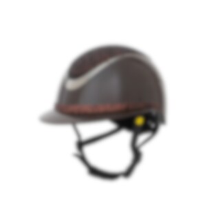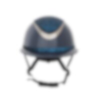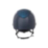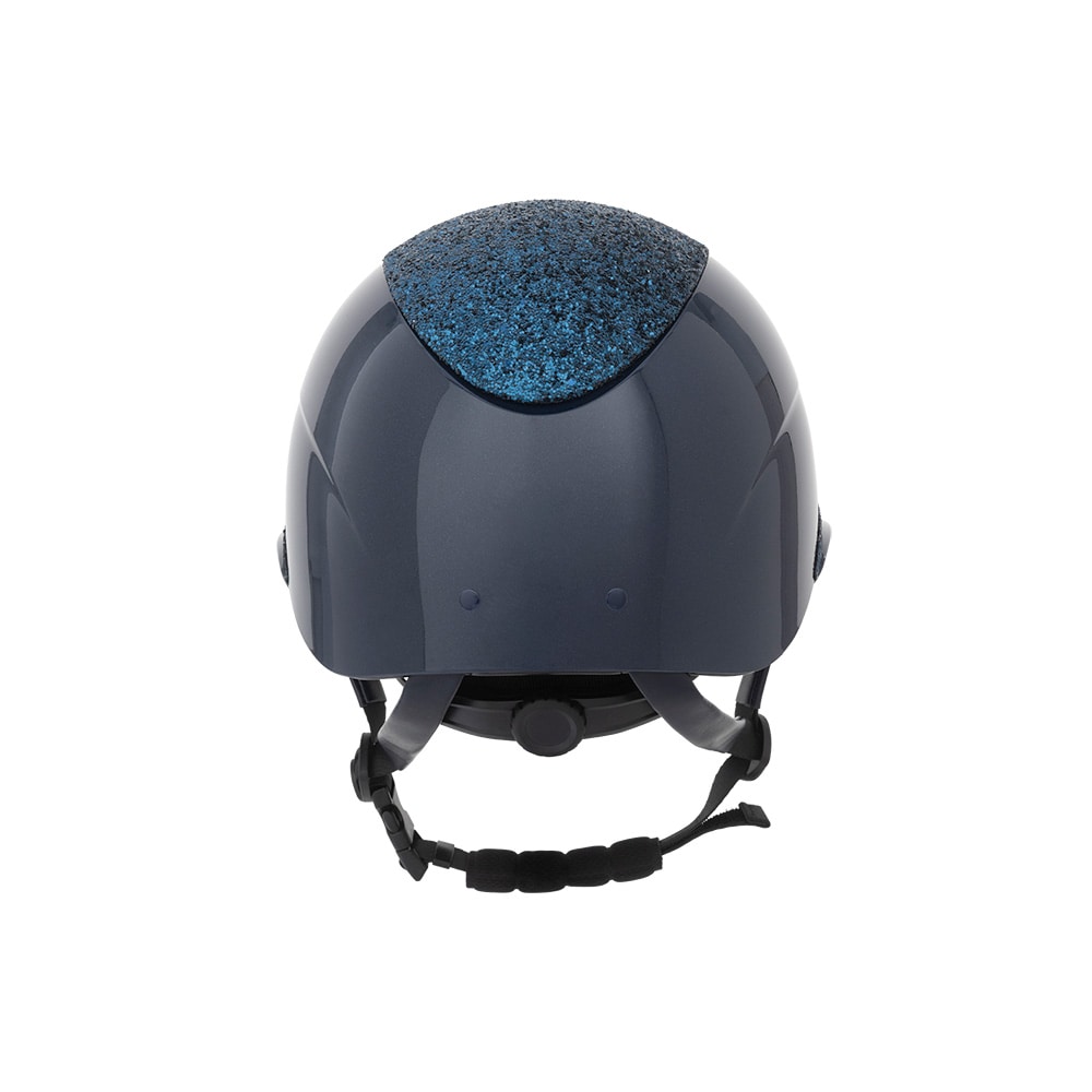 Ratsastuskypärä kiiltävällä metalliviimeistelyllä, koristeltu keskilevy ja koristeellinen yksityiskohta reunan yläpuolella. Kevyt paino ja ilmanvaihto edessä ja takana tarjoavat kypärän, joka on mukava koko ratsastusistunnon ajan. Säädettävissä ruuvilla t