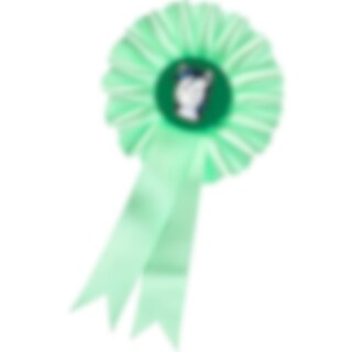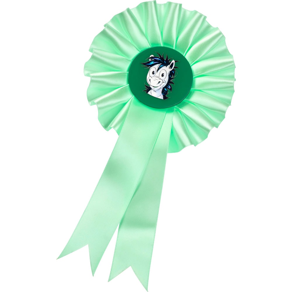Ruusuke, jonka keskellä Mulle-kuva. Mukana toimitetaan kiinnitysklipsit, jotka sopivat suitsiin/riimuun. Kokonaispituus: 20 cm, leveys: 10 cm.