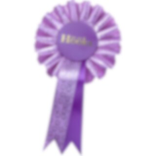 Palkintoruusuke keppihevoselle, hakaskiinnitys. Ruusukkeessa kultapainatus ja nauha. Kokonaispituus: 21 cm, leveys: 11 cm.