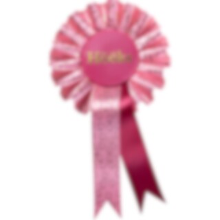 Palkintoruusuke keppihevoselle, hakaskiinnitys. Ruusukkeessa kultapainatus ja nauha. Kokonaispituus: 21 cm, leveys: 11 cm.