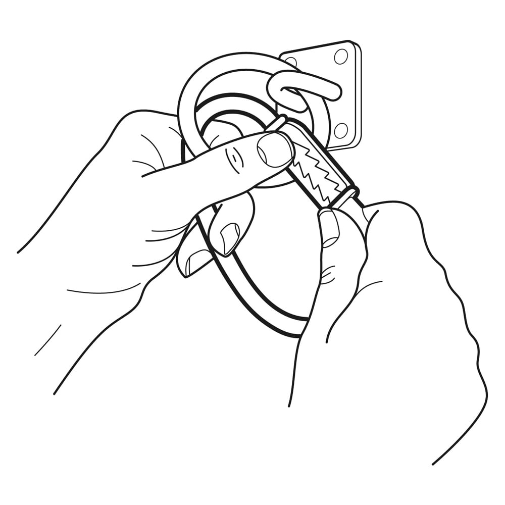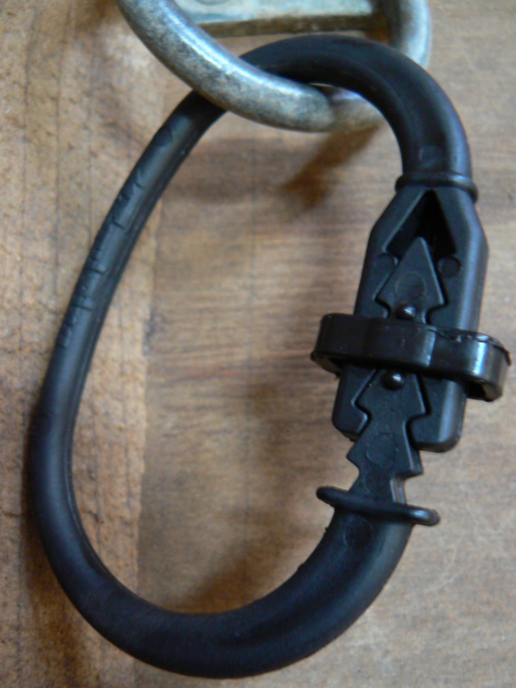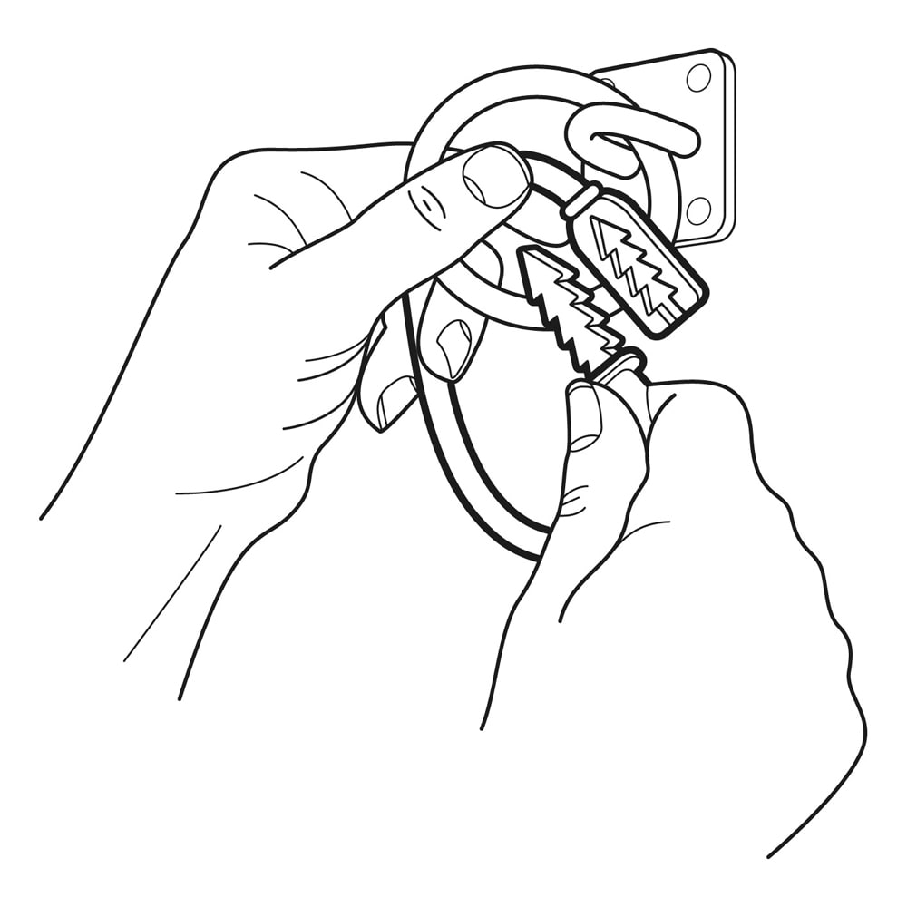 Kiinnitä Equi-Ping esim. tallikäytävän, karsinan, vesikarsinan tai trailerin metalliseen kiinnitysrenkaaseen. Kiinnitä sen jälkeen riimunvarsi Equi-Pingiin, joka avautuu automaattisesti hätätilanteessa.